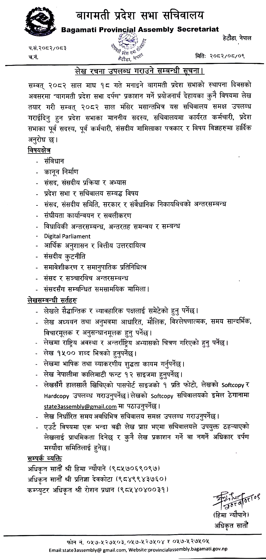 लेख रचना उपलब्ध गराउने सम्बन्धी सूचना।  | बागमती प्रदेश सभाको अधिवेशन अन्त्य सम्बन्धी सूचना ।  | माननीय सभामुखको राजीनामा सम्बन्धी सूचना  | लेख रचना उपलब्ध गराउने सम्बन्धी सूचना।  | प्रदेश सभाको बैठक सम्बन्धी सूचना।  | प्रदेश खानेपानी तथा सरसफाइ सम्बन्धमा व्यवस्था गर्न बनेको विधेयक  | प्रदेश आर्थिक कार्यविधि तथा वित्तीय उत्तरदायित्व सम्बन्धमा व्यवस्था गर्न बनेको विधेयक  | प्रदेश सरकारी कामकाजको भाषा सम्बन्धमा व्यवस्था गर्न बनेको विधेयक  | प्रदेश सञ्‍चार माध्यम व्यवस्थापन ऐन, २०७५ लाई संशोधन गर्न बनेको विधेयक  |
